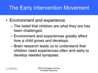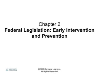 The document discusses landmark federal legislation related to early intervention and education for people with disabilities. It outlines laws such as the University Affiliated Facilities Act, Handicapped Children's Early Education Assistance Act, Head Start Act, Developmental Disabilities Act, Education for All Handicapped Children Act (now IDEA), Americans with Disabilities Act, Section 504 of the Rehabilitation Act, and No Child Left Behind Act. It describes how each law aimed to improve services, access, and education for people with disabilities.