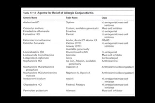 This document discusses different types of allergic eye diseases including acute allergic conjunctivitis, seasonal and perennial allergic conjunctivitis, vernal keratoconjunctivitis (VKC), and atopic keratoconjunctivitis (AKC). It describes the presentation, diagnosis, and treatment of each condition. Acute allergic conjunctivitis commonly affects children and presents as itching and watering. VKC and AKC are chronic, inflammatory conditions that predominantly affect children and young adults. They can progress to involve the cornea and cause scarring if not properly treated with mast cell stabilizers, antihistamines, steroids, and immunosuppressants.
