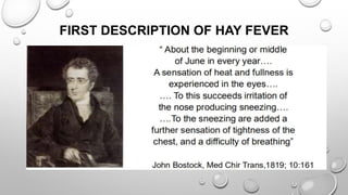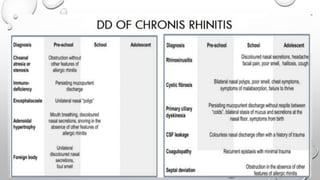 Allergic rhinitis is an IgE-mediated inflammatory disease of the nasal mucosa caused by an allergic reaction to inhaled allergens. It is characterized by symptoms like sneezing, rhinorrhea, nasal congestion and nasal itching. Diagnosis involves assessing symptoms, performing skin prick tests or measuring allergen-specific IgE levels. Management includes allergen avoidance, oral antihistamines, intranasal corticosteroids and immunotherapy. Allergic rhinitis can negatively impact quality of life and is associated with conditions like asthma and sinusitis if left untreated.
