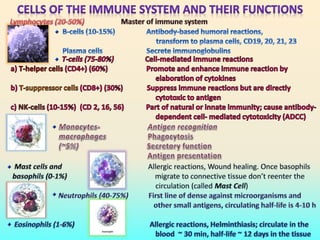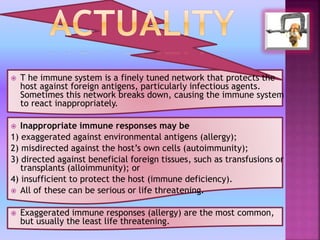 The document discusses the immune system as a complex network defending against foreign antigens, including its potential failures leading to allergies, autoimmunity, alloimmunity, and immune deficiencies. It emphasizes the roles of innate and adaptive immunity, the presence of different antibodies, and mechanisms of immunological tolerance, detailing the significance of Major Histocompatibility Complex (MHC) proteins. Additionally, it explores autoimmune diseases, particularly systemic lupus erythematosus, outlining genetic and environmental factors contributing to such conditions.