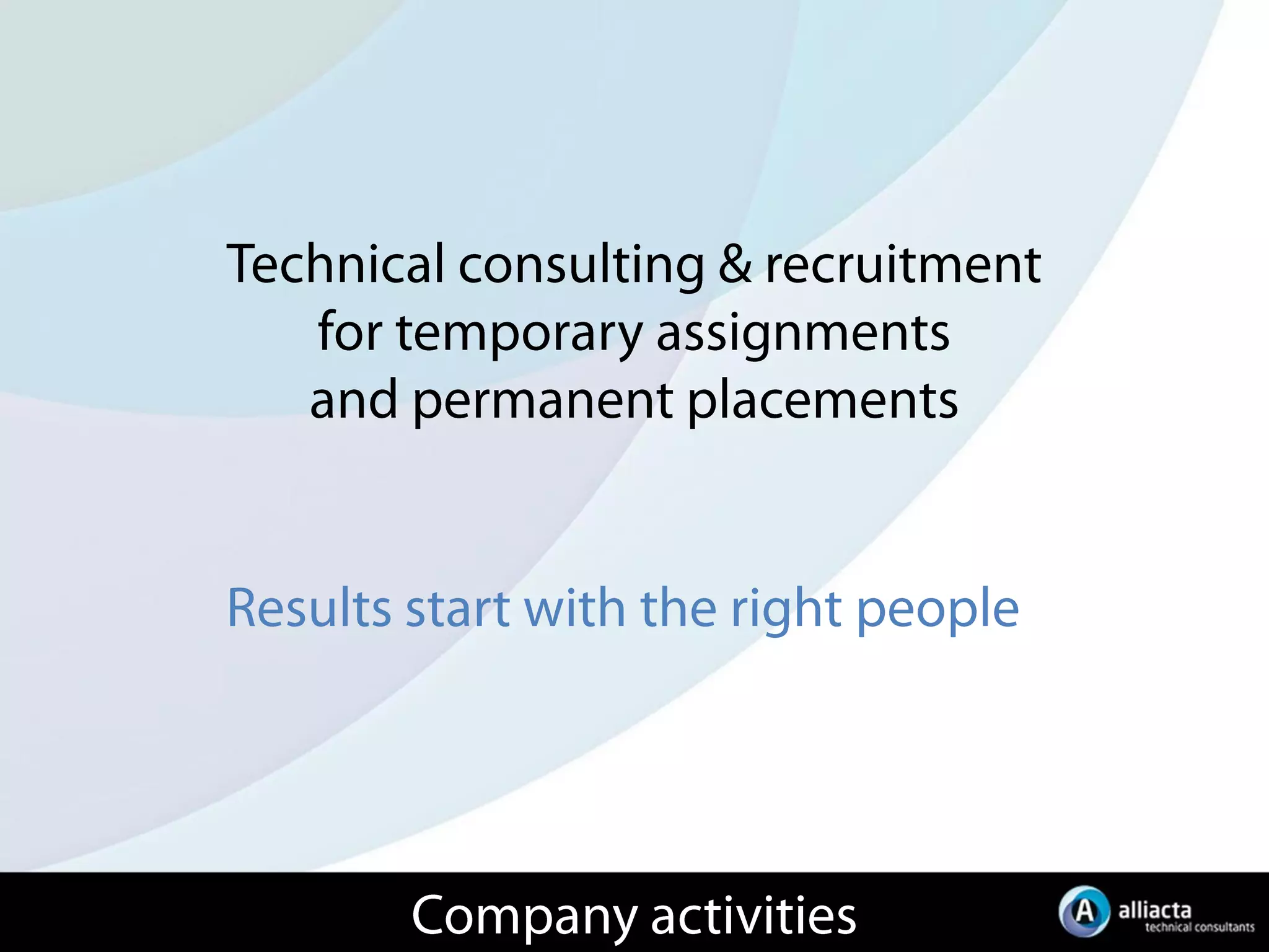 Company presentation anno 2014 on Alliacta's main services: - project sourcing - recruitment & selection for technical profiles in Flanders, the Netherlands, Germany and abroad.