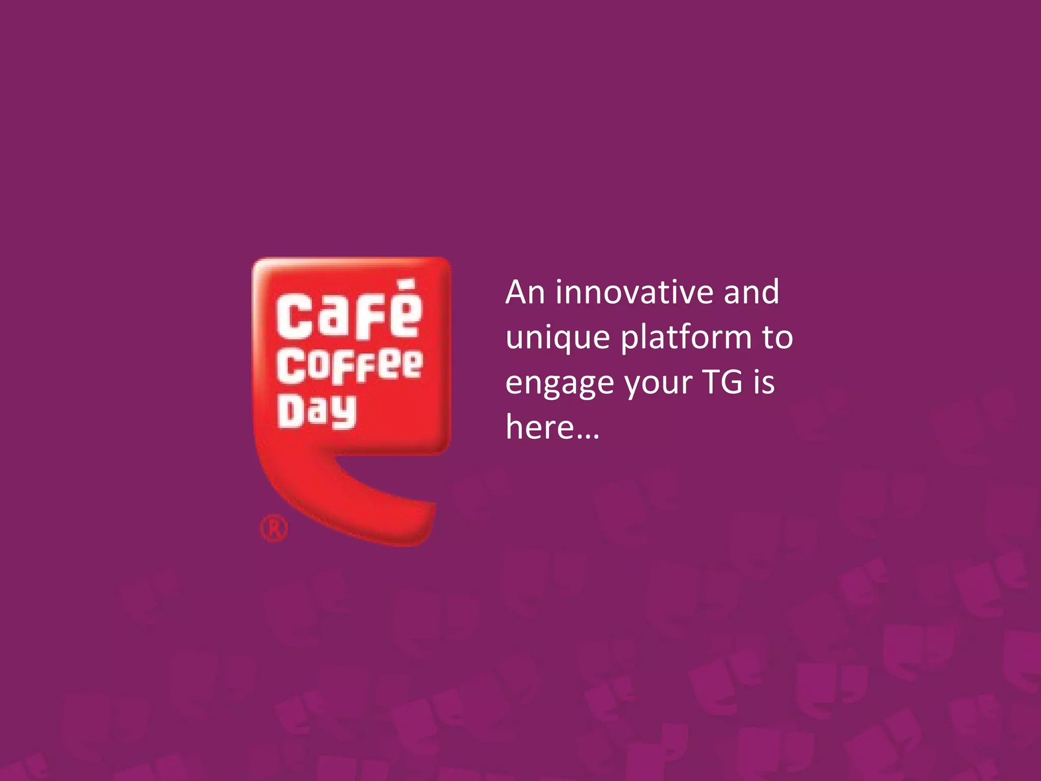 Café Coffee Day is India's largest coffee chain with over 1400 cafés across 200 cities. It aims to engage target audiences through innovative branding and activations at cafés. The document outlines Café Coffee Day's target audience as mostly 20-30 year olds who spend about 45 minutes at cafés. It details various branding options available and shares examples of successful past campaigns for brands like Britannia, Nokia, and Tupperware. The document promotes Café Coffee Day's cafés as a unique media platform for brands to creatively engage with customers.