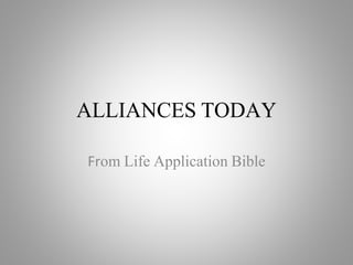 The document discusses how modern society often puts its trust and hope in things other than God, such as government legislation, science, education, medicine, financial security, and other alliances. It provides examples from the Bible, including Isaiah warning Judah not to ally with Egypt and put their trust in military might instead of God. Similarly today, while we enjoy benefits from these other areas, we should not lose sight of ultimately putting our trust in God rather than in people or systems of the world.