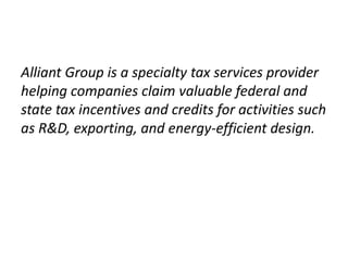 alliantgroup lp is a specialty tax services provider that assists companies in claiming federal and state tax incentives and credits. They focus on areas like research and development, exporting, and energy-efficient design. The company is located at 5400 Westheimer Court, Suite 700, Houston, TX 77056.