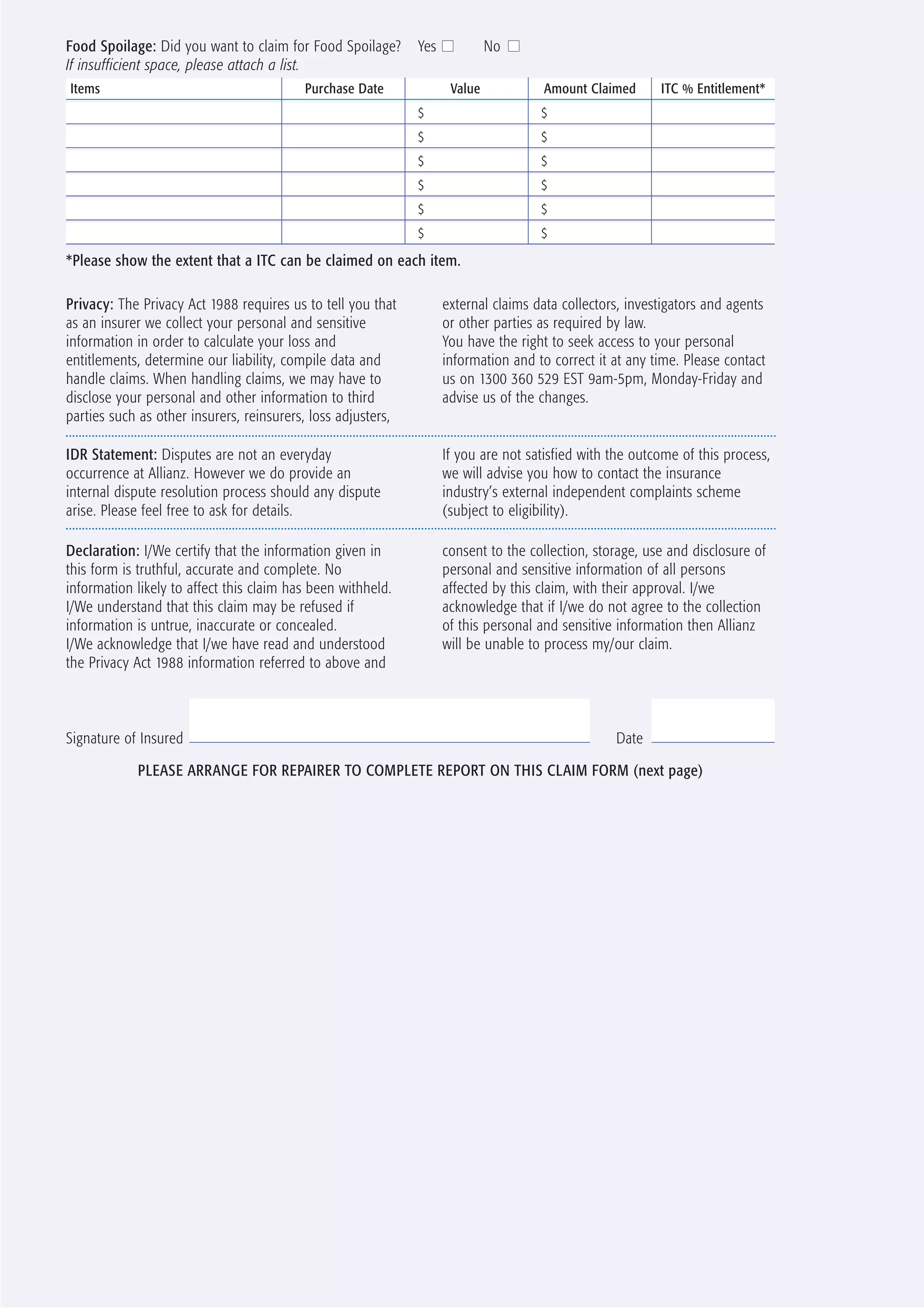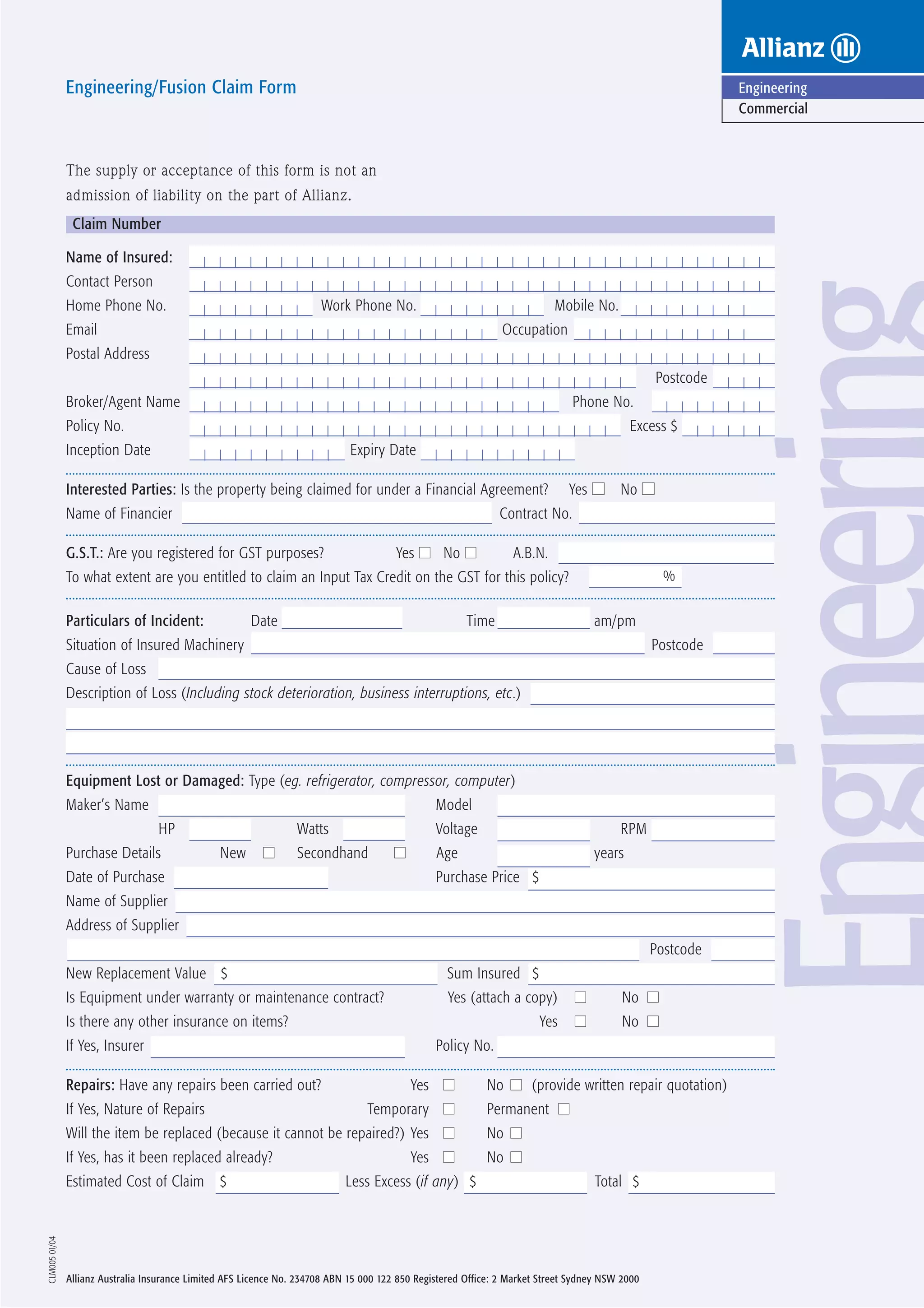 The document is an engineering/fusion claim form for an insured named John Doe. It requests information about the incident, damaged equipment, repairs, costs, and other relevant details to process an insurance claim. The insured is claiming damage to a refrigerator that needs repairs costing a total of $1,500 according to the attached repair quote.