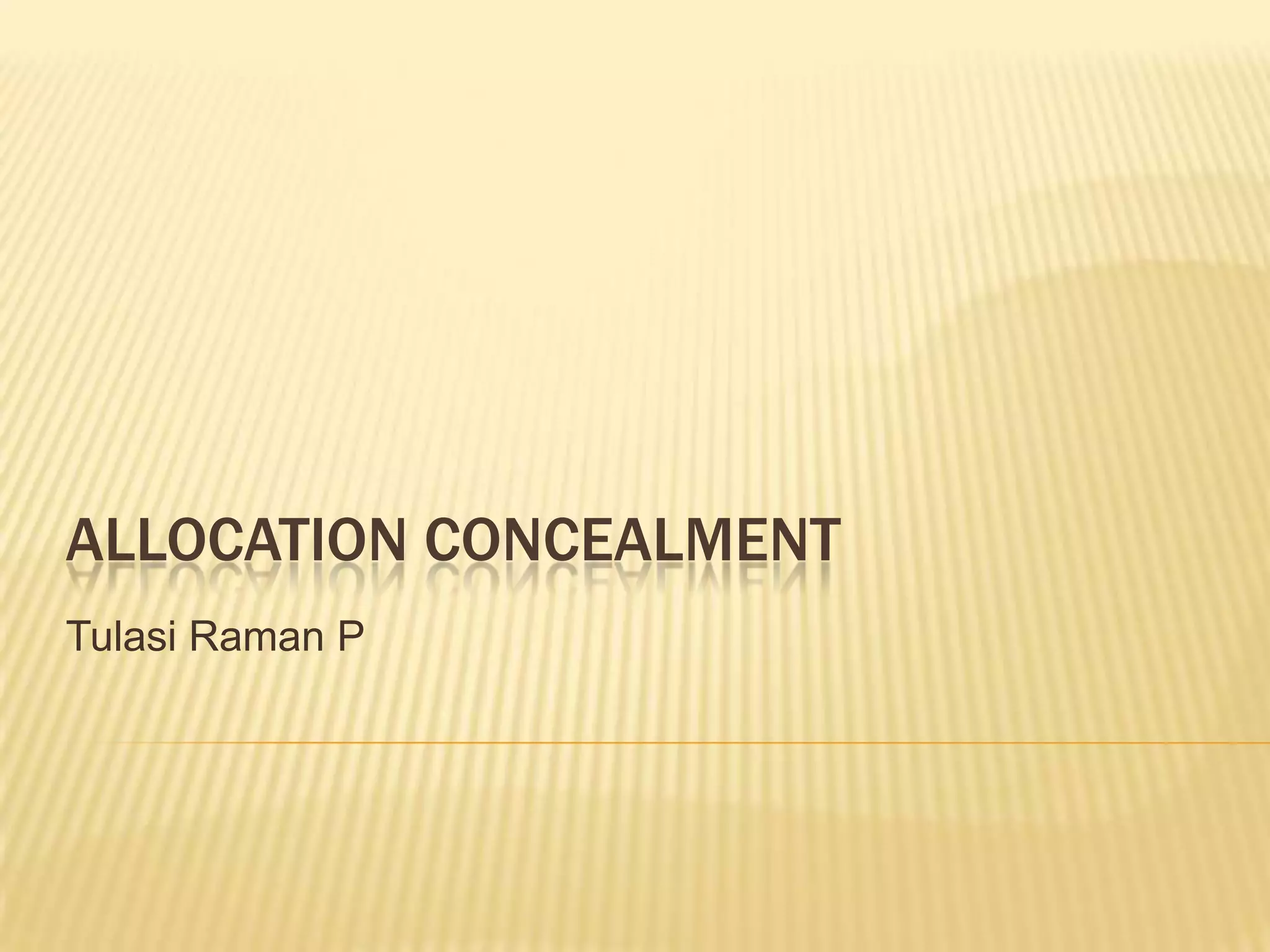 This document defines allocation concealment and discusses its importance in clinical trials. Allocation concealment refers to preventing investigators from knowing the next treatment assignment so they cannot influence which participants are assigned to different study arms. Inadequate allocation concealment can introduce bias and invalidate trial results. The document provides examples of how allocation concealment can be deciphered or biased and recommends methods like sequentially numbered sealed envelopes and centralized randomization to properly conceal allocations.