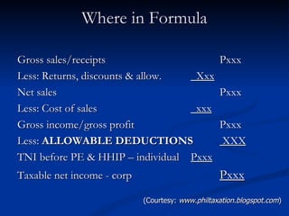 Allowable deductions from gross income include optional standard deductions, itemized deductions, and net operating loss carryovers. Optional standard deductions allow taxpayers to deduct 40% of gross income in lieu of itemizing expenses. Itemized deductions must be ordinary and necessary expenses incurred for business purposes and substantiated. Major categories of itemized deductions include salaries and wages, travel expenses, rental expenses, interest expenses, taxes, losses, bad debts, and depreciation.
