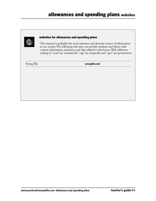 The document provides a lesson plan for teaching students about allowances and spending plans. It includes activities to help students practice dividing an allowance into categories for spending, saving, and giving. Students will track their expenses in a spending diary and then use the data to create a personalized written spending plan. The goal is for students to gain experience developing and following a spending plan so they learn responsible money management skills.