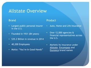 Allstate is the largest personal insurer in the US, founded in 1931 with $35.2 billion in revenue. It offers auto, home, and life insurance through over 12,000 agencies across the US. Allstate's target market includes older adults aged 30-60, affluent individuals, and homeowners. It has a large social media presence with over 454,000 Facebook likes and 68,000 Twitter followers. Allstate's online marketing strategy focuses on SEO, developing new apps and software, and measuring success through metrics like cost per click.