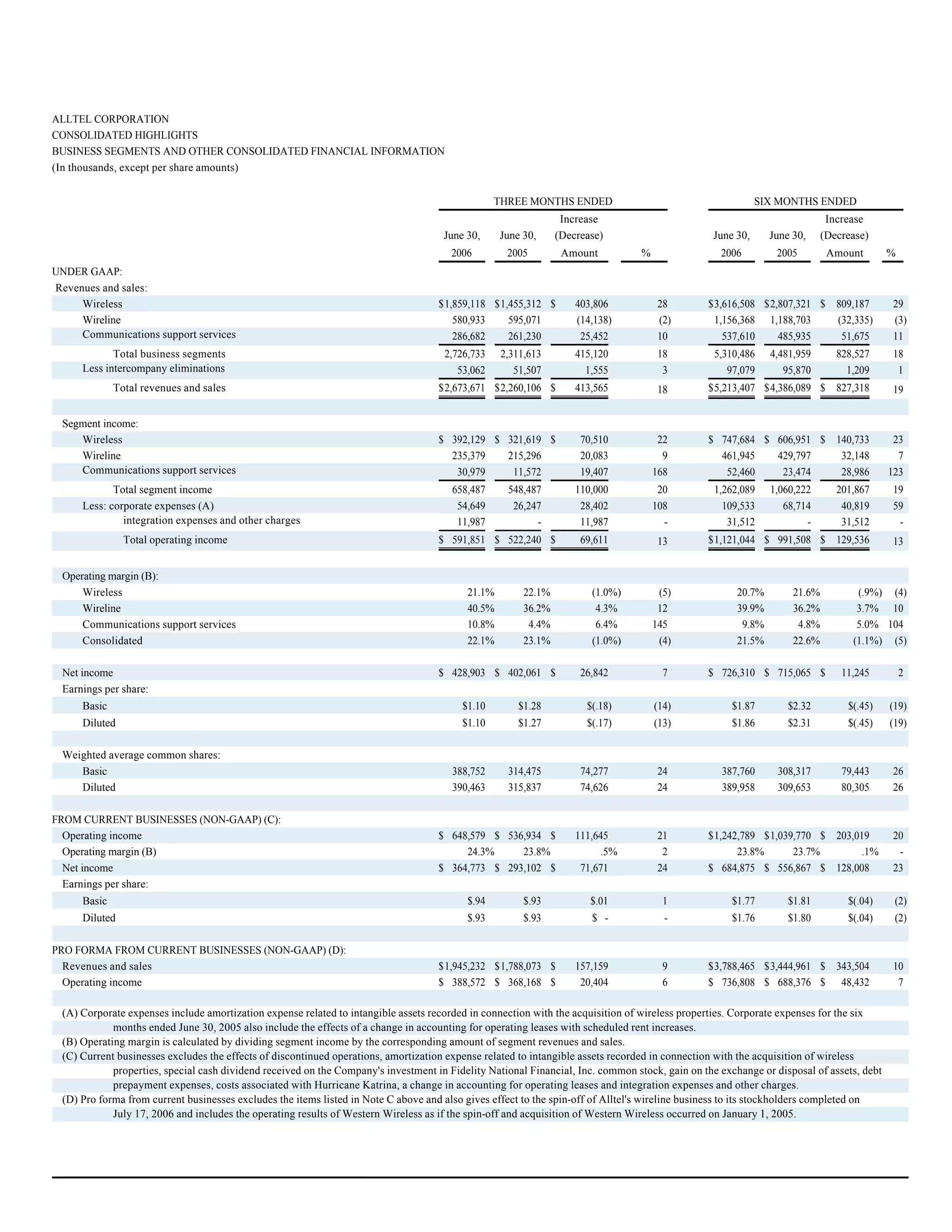 - Revenues and sales increased for ALLTEL's wireless and communications support services segments but decreased slightly for its wireline segment in both the three-month and six-month periods. - Total operating income increased 13% and segment income increased 20% for the three-month period compared to the previous year. For the six-month period, total operating income increased 13% and segment income increased 19%. - Earnings per share on a basic and diluted basis decreased year-over-year for both periods under GAAP due to higher corporate expenses and integration costs.