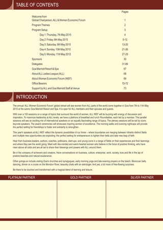 The annual ALL Women Economic Forum global retreat will be held from May 7-11, 2015 at the Goa Marriott Resort and Spa in Goa, India. Over 300 delegates from 23 countries will attend over 100 sessions covering a range of topics related to women. The sessions will explore themes such as work-life balance, security and vulnerability issues for women, the role of technology and communication, and entrepreneurship and growth. Keynote speakers will include business leaders, authors, politicians and other prominent women. Activities will include visits to local churches and synagogues, yoga on the beach, a river dinner cruise, and discussions with an astrologer. The goal of the forum is to empower women