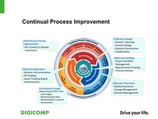 The document discusses Application Lifecycle Management (ALM) and service lifecycle management using TFS, emphasizing continual process improvement, solution design, and project portfolio management. It outlines various stages such as service strategy, service transition, and service operation, highlighting key tasks like requirements tracking, quality assurance, and change management. Additionally, it mentions the use of Microsoft tools and template processes for managing work items and reporting.
