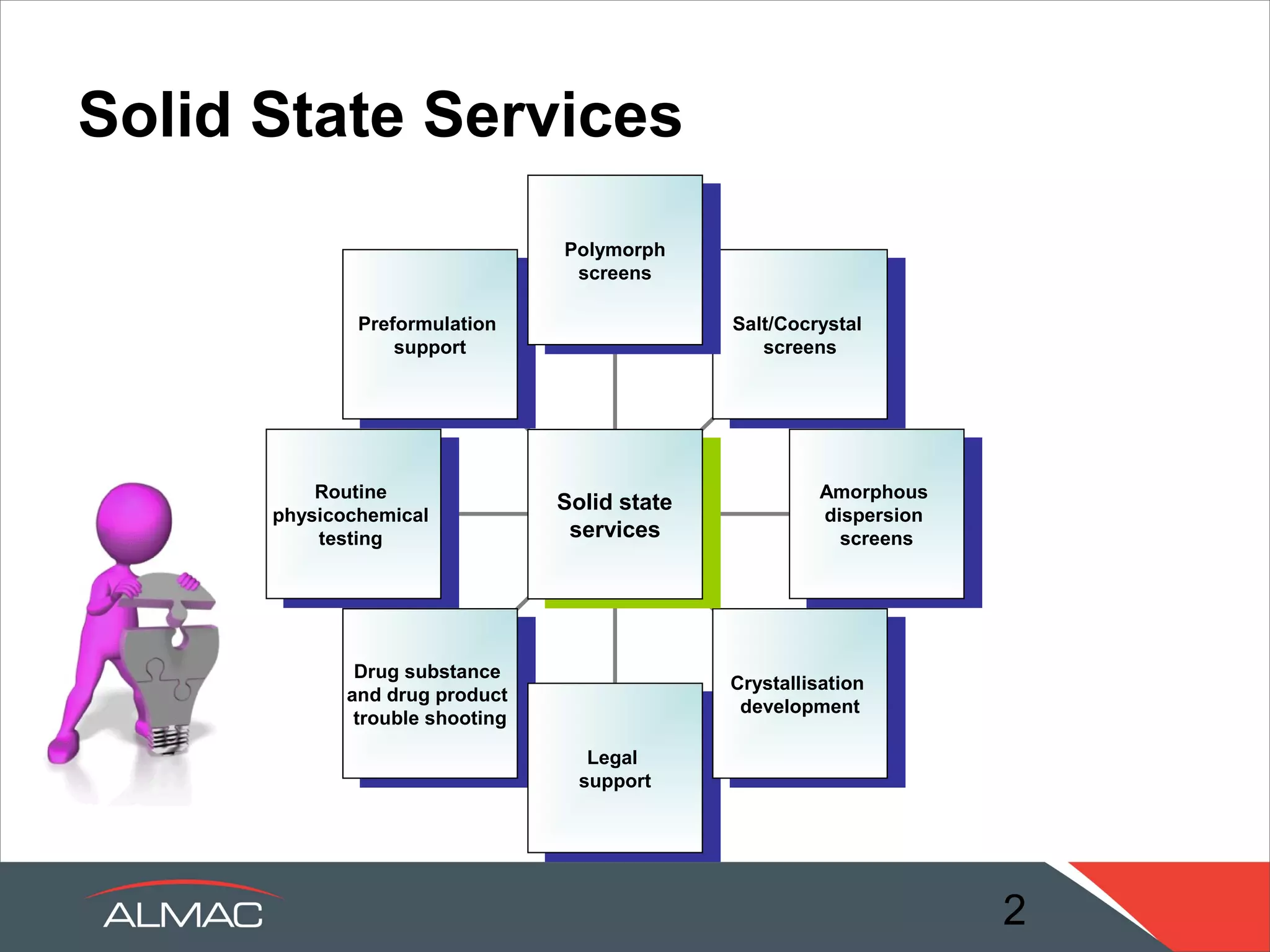 The document describes the solid state services provided by ALMAC including polymorph screens, salt/cocrystal screens, amorphous dispersion screens, and crystallization development. It discusses how the solid state group acts as a link between chemistry and formulation to transfer knowledge about active pharmaceutical ingredients. A range of expert services and in-house technologies are available to support drug development including rapid formulation screening, analytical support, and pre-formulation studies.
