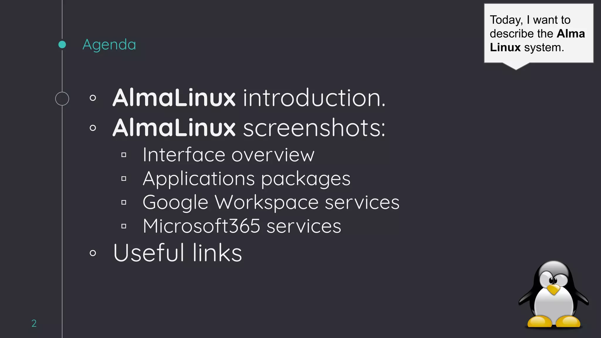 AlmaLinux OS is an open-source, community-driven operating system, functioning as a binary-compatible clone of Red Hat Enterprise Linux, aimed at filling the gap left by CentOS's discontinuation. It includes basic applications and offers easy installation of additional software, with compatibility for Google Workspace and Microsoft 365 services. The document provides links for further information and installation resources.