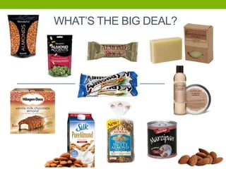 This document provides an overview of almonds, including their history, production, and harvest process. It notes that almonds are grown on over 450,000 acres in California's San Joaquin Valley, which produces 80% of the world's almonds. Almonds were first cultivated over 4,000 years ago in Central Asia and the Mediterranean. They were brought to California by Spanish Franciscans in the 1700s and have become a major export crop, with the harvest now topping 2 billion pounds annually. The document outlines the almond lifecycle and production process, which involves pollination, irrigation, pest management, and harvesting from August to October.