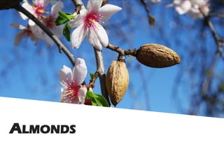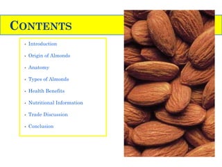 Almonds originate from Prunus dulcis trees and are cultivated for their edible seeds. There are different types of almonds including bitter, sweet, and California almonds. Almonds provide many health benefits as they are a rich source of proteins, vitamins, minerals, fats, and fiber. Specifically, almonds may help prevent heart disease, support brain health, maintain skin health, control blood sugar levels, aid in weight loss, and increase nutrient absorption. While almonds provide these benefits, they also face issues in international trade that must be discussed.