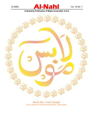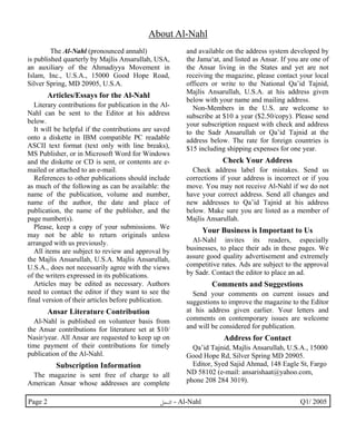 The document is a quarterly publication titled 'al-nahl' by Majlis Ansarullah, USA, addressing members of the Ahmadiyya movement. It includes details on submission guidelines, subscription information, content overview, and articles focused on Quranic principles, the role of faith and spirituality, along with various contributions on health and well-being. The publication emphasizes the importance of community involvement and adherence to Islamic teachings, offering insights from religious leaders and scholars.
