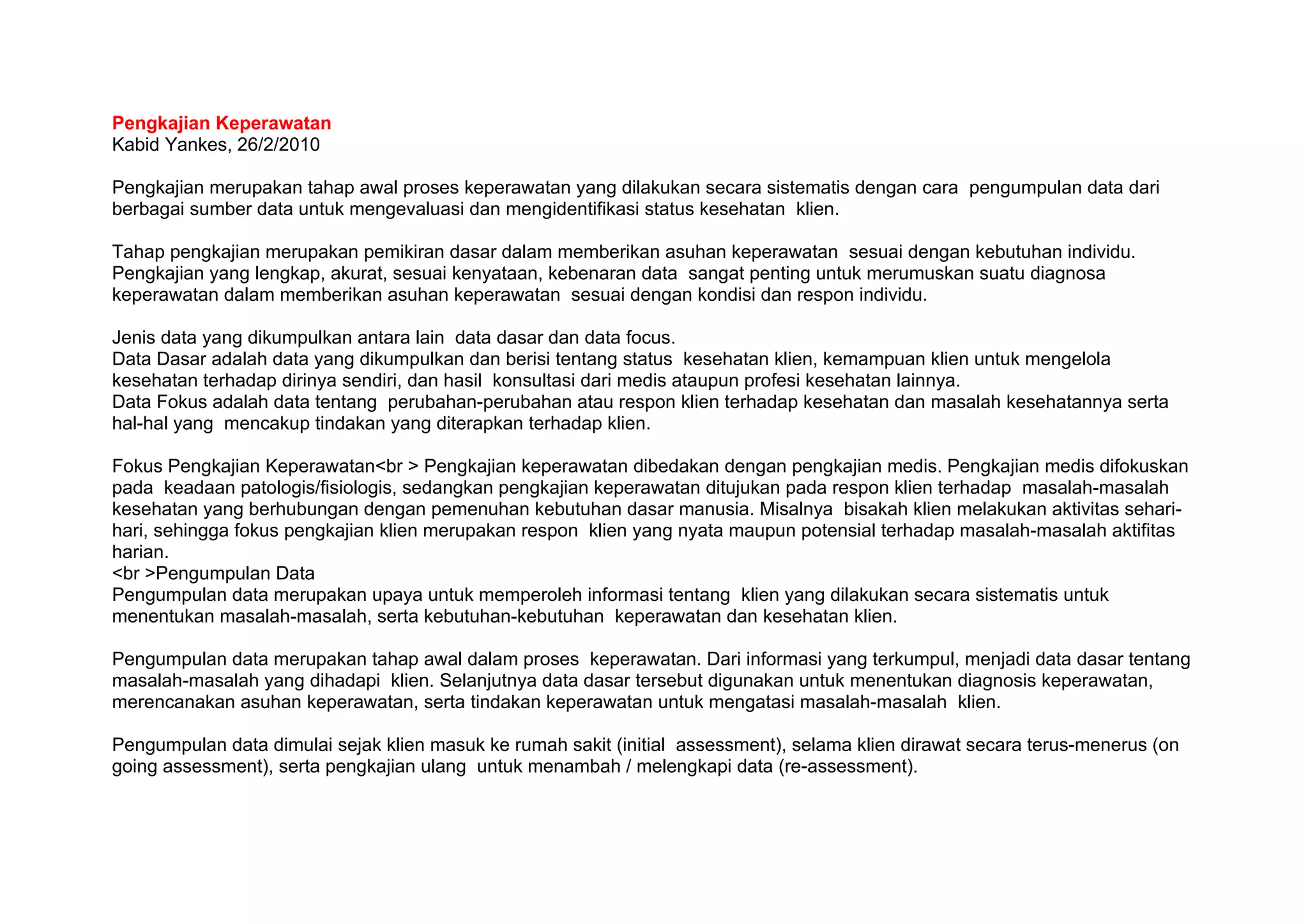 Dokumen tersebut membahas tentang pengkajian keperawatan yang meliputi pengumpulan data secara sistematis dari berbagai sumber untuk mengevaluasi status kesehatan pasien, mencakup wawancara, observasi, dan pemeriksaan fisik guna mengidentifikasi masalah dan merencanakan perawatan. Pengkajian awal merupakan tahap penting dalam memberikan perawatan yang sesuai dengan kebutuhan pasien.