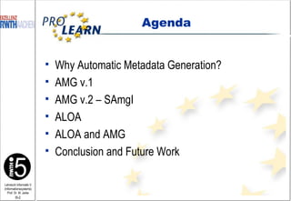 ALOA is a framework for automatically generating metadata for learning objects (LOs). It uses a service-oriented architecture and web services to allow for flexible and extensible metadata generation. ALOA's core engine indexes LOs, extracts properties from them using extractors, generates metadata using generators, resolves conflicts, and translates the metadata. New extractors and generators can be easily plugged into ALOA. It provides automatically generated LOM metadata for online LOs in different formats and languages through a web services API.