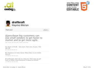 The document discusses Aloha Editor, an open source online content editing tool. It provides an overview presentation given by Haymo Meran on Aloha Editor. Meran discusses how Aloha Editor aims to provide a simple and intuitive editing experience similar to Microsoft Word. He demonstrates some of Aloha Editor's features, such as collaborative editing and integration with content management systems. Meran also shares statistics on Aloha Editor's use and discusses how it supports the new HTML5 standard to improve the web editing experience.