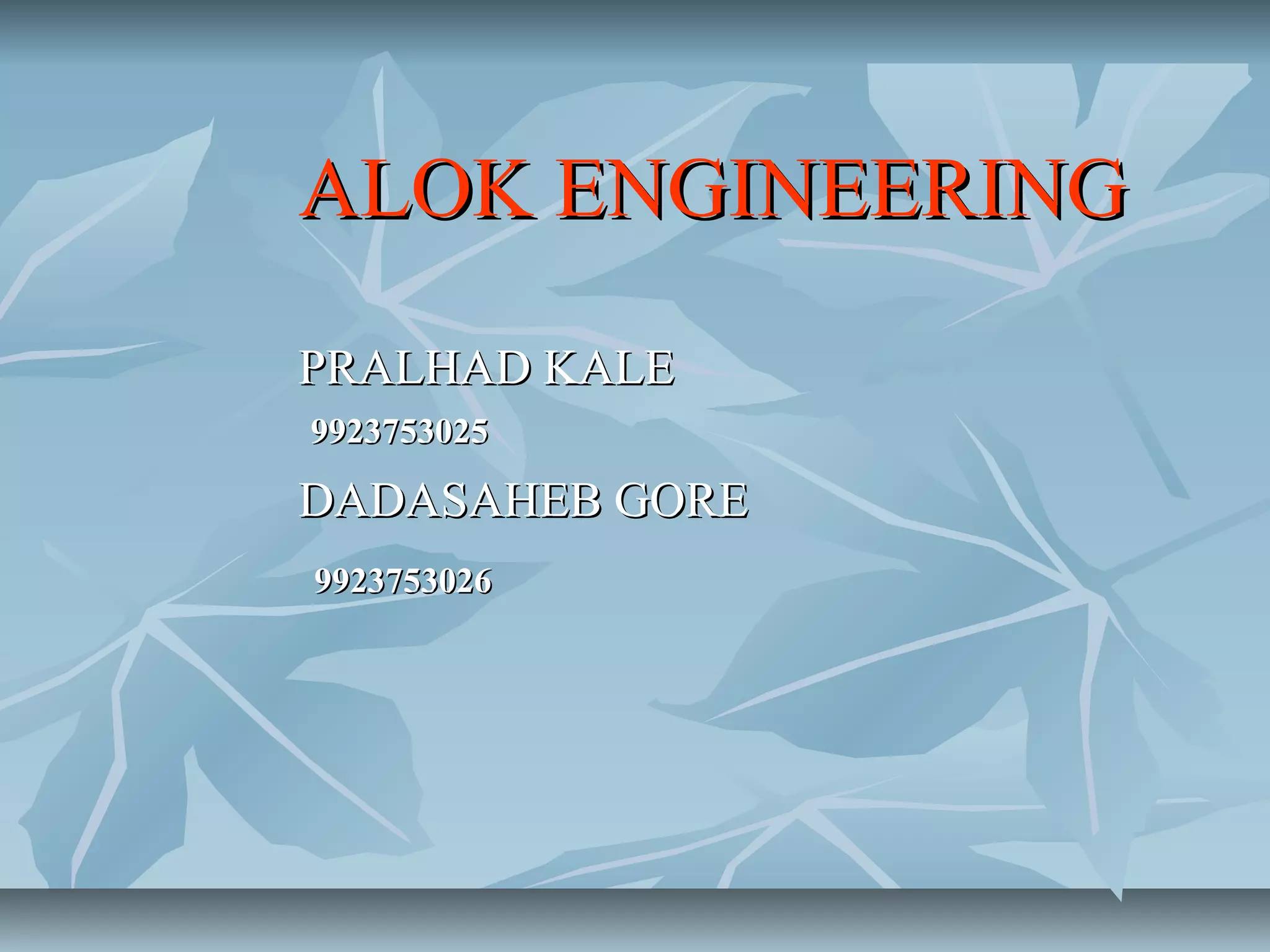 Alok Engineering is a company located at Plot No. C-233 in the M.I.D.C. industrial area. The contact details provided are for Pralhad Kale at phone number 9923753025 and Dadasaheb Gore at phone number 9923753026.