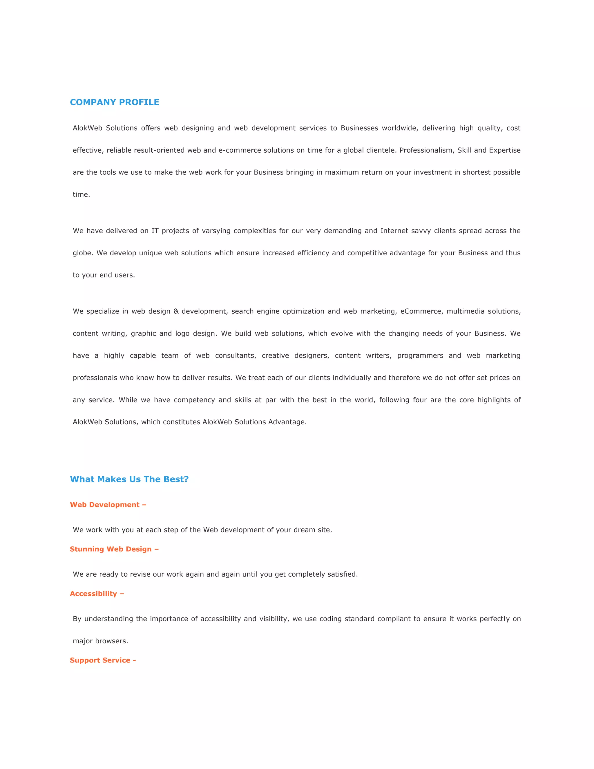AlokWeb Solutions provides a range of web development and design services including website design, development, e-commerce solutions, and web hosting. They have a team of experienced professionals and aim to deliver high quality, cost-effective solutions. Their services help businesses function more efficiently and increase their online presence and profitability.