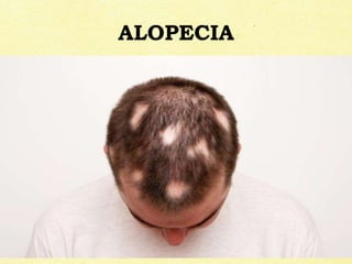 - Alopecia refers to hair loss and there are several types including alopecia areata (patchy hair loss), alopecia totalis (complete hair loss of the scalp), and alopecia universalis (complete hair loss of the body).