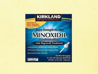 Alopecia is defined as hair loss from areas where hair normally grows. There are several types of alopecia including alopecia areata (patchy hair loss), alopecia totalis (total hair loss of the scalp), alopecia universalis (total hair loss of the entire body), and androgenetic alopecia (male or female pattern baldness). Causes can include autoimmune conditions, certain medications, medical conditions, radiation/chemotherapy, and genetics. Diagnosis involves history, physical exam, and sometimes blood tests. Treatment options include minoxidil, finasteride, corticosteroid injections, wigs, hair transplants, massage, and UV light therapy.