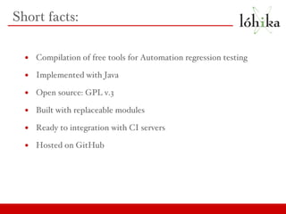 The document outlines a Java-based open-source tool called ALP, designed for automation regression testing. It features configurable modules for integration with CI servers, categorized test case execution, and comprehensive reporting capabilities, including error details and customizable output formats. Additional functionalities include automatic screenshot creation and support for various reporting extensions.