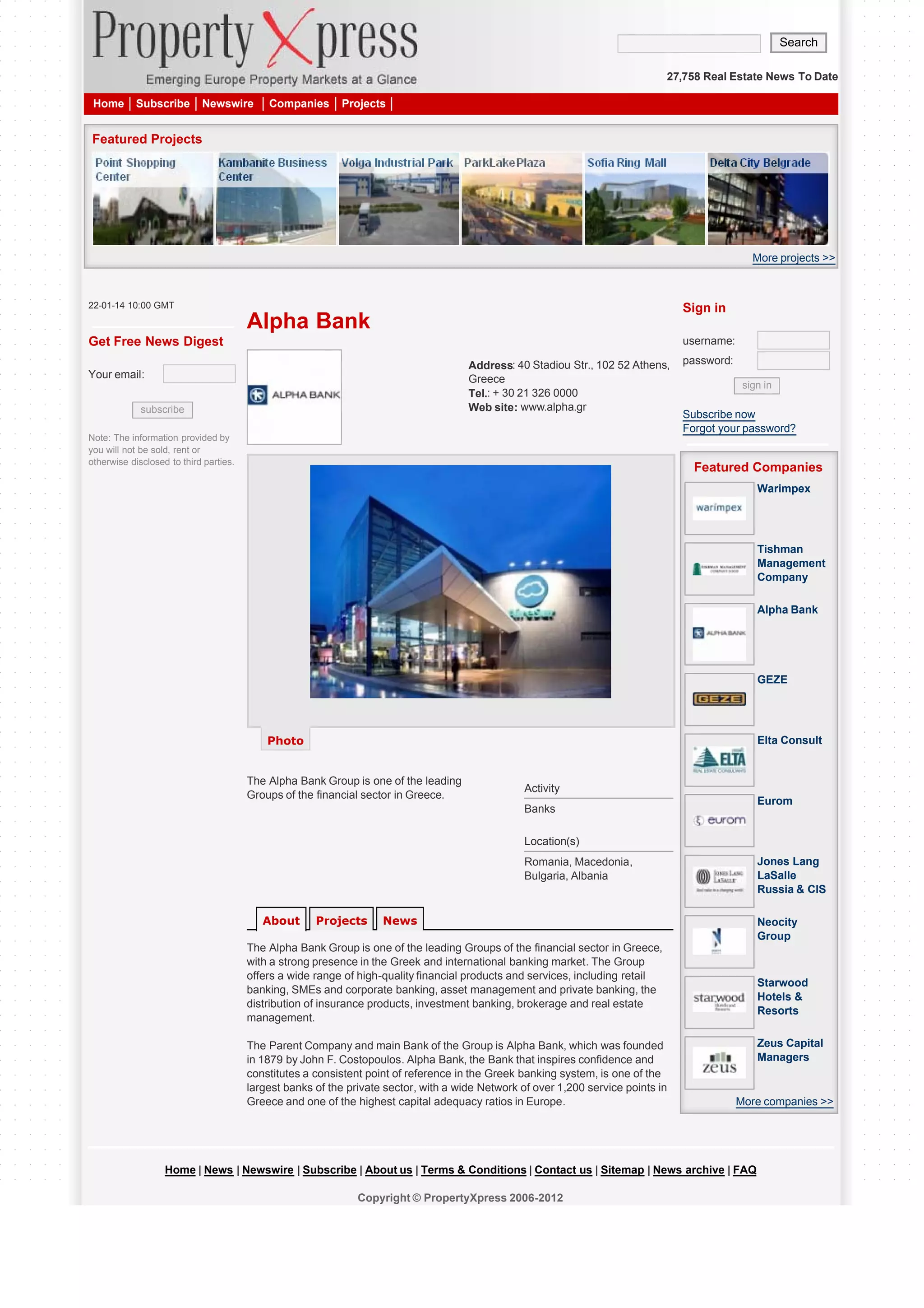The document provides an overview of Alpha Bank, a leading financial group in Greece, detailing its diverse banking services and significant presence in both Greek and international markets. Additionally, it discusses various real estate developments and transactions in Romania, including insolvency proceedings for major developers and the sales of residential and commercial properties. The document highlights Alpha Bank's involvement in managing and taking over real estate projects in the region.