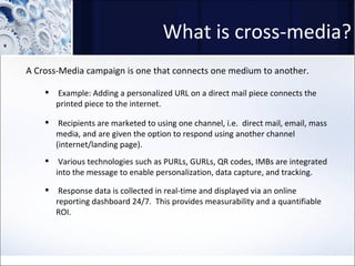 The document discusses cross-media and multi-channel marketing strategies. It defines cross-media marketing as connecting different mediums, like adding a URL to direct mail, to track responses across channels. Multi-channel marketing uses two or more channels simultaneously, like direct mail, email, and social media, to increase campaign effectiveness. The document provides examples of using different technologies like QR codes and personalized URLs to connect offline and online channels and gather customer data. It also presents case studies of colleges that saw increased engagement and fundraising results from cross-media campaigns integrating direct mail, email, and web landing pages.