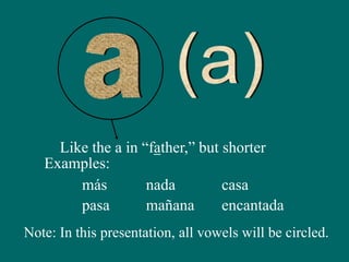 The document provides an overview of the pronunciation of each letter in the Spanish alphabet. It discusses the sounds of each consonant and vowel, noting similarities and differences to English pronunciation. Key points include that vowels are generally shorter than in English, and that consonants like b, d, g, and p are not aspirated as in English. Diacritical marks like the tilde and digraphs like ll and rr indicate distinct sounds as well.