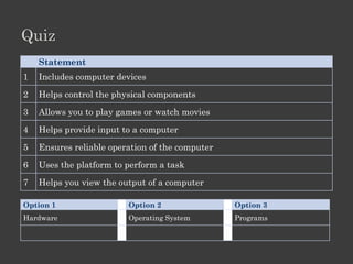 The document outlines an Alpha Tech Program trainer kit that aims to remove fear, be simple and fun, and teach computer basics like operating systems, the internet, email, and digital media through modules that cover topics such as word processing, spreadsheets, and presentations. The trainer kit includes lessons on computer parts, starting and shutting down computers, using keyboards and mice, basic terminology, and introduces functions of operating systems, the internet, email, and instant messaging.
