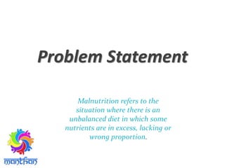 Malnutrition is a major problem in India, with over 1/3 of the world's malnourished children living in India. The document outlines the scope and causes of malnutrition in India. Major causes include poverty, food prices, dietary practices, lack of breastfeeding, and gender inequality. It then proposes multi-sector solutions that address the issue across the entire lifecycle through both direct interventions like supplements and feeding practices, and indirect interventions like access to water/sanitation, education, and socio-cultural factors. The solutions framework is based on principles of addressing the nutrient deficit, breaking intergenerational cycles, and coordinated multi-sector actions. Mega coordination across ministries and sectors is needed to effectively implement the solutions