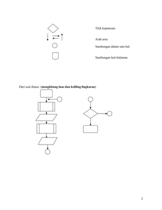 Dokumen ini menjelaskan definisi dan penyajian algoritma, termasuk penggunaan pseudocode dan flowchart. Selain itu, terdapat penjelasan terkait program dalam Turbo Pascal, tipe data, serta contoh implementasi algoritma, seperti algoritma Euclid untuk mencari FPB. Juga dibahas tentang struktur pemrograman dan kontrol, termasuk seleksi dan perulangan.