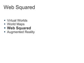 The document discusses how the virtual and real worlds are converging through technologies like augmented reality, sensors, and an "internet of things" where everyday objects are connected. It provides examples of how augmented reality overlays information about the real world using smartphone cameras and apps. Publishers will need to consider how to publish and provide information in these new augmented contexts where readers can access location-specific data overlaid on the real world.