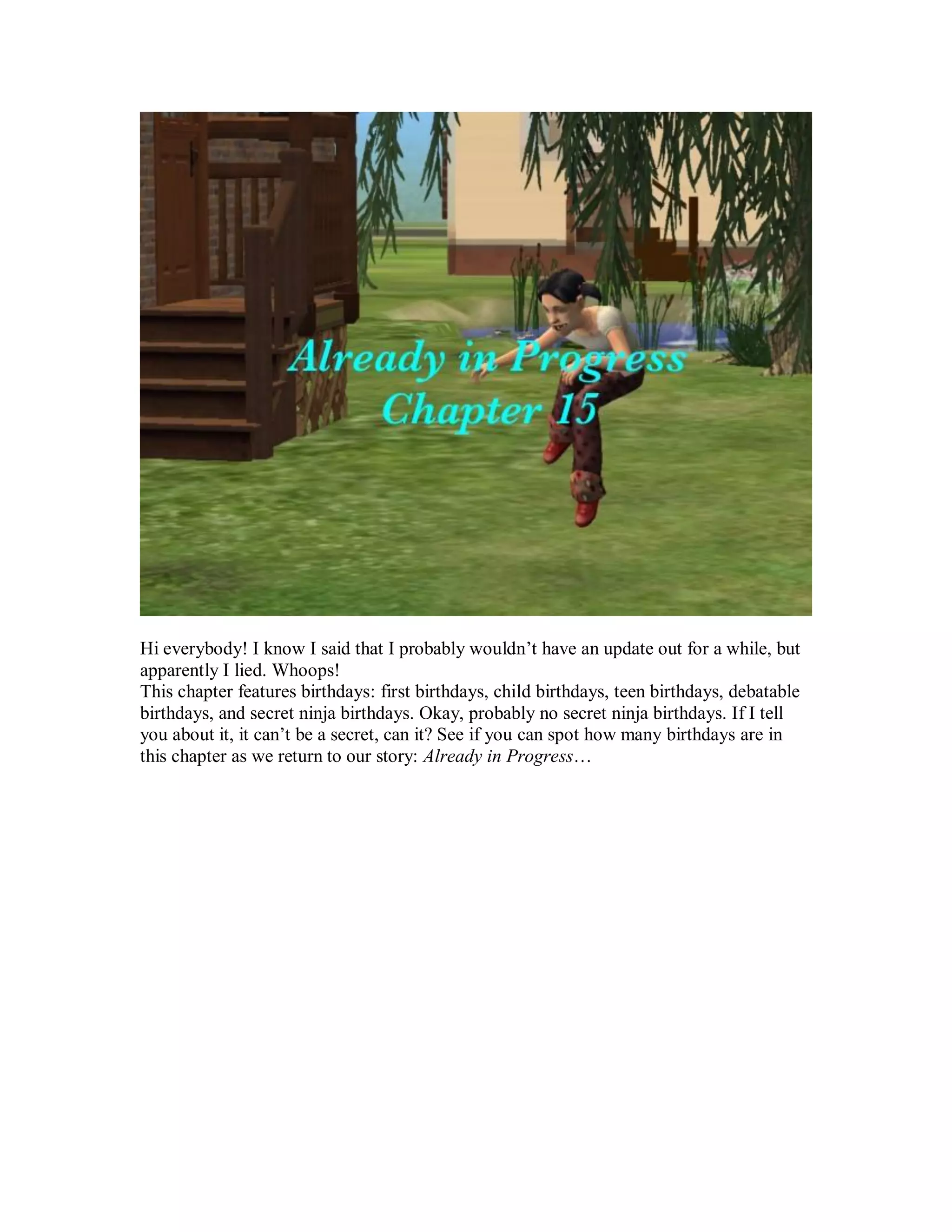 This document discusses several birthdays that occur in the chapter. It begins by introducing Bertram McClellan having his birthday breakfast. It then shows the birth of Ryan, the second birthday in the Miller household. Later, it mentions Simon Couderc becoming a toddler as another birthday. The document provides updates on many characters and families, with a somber note about the passing of Francois Sanders. It ends with Perry giving Amy a gift, though she seems unsure of their relationship.