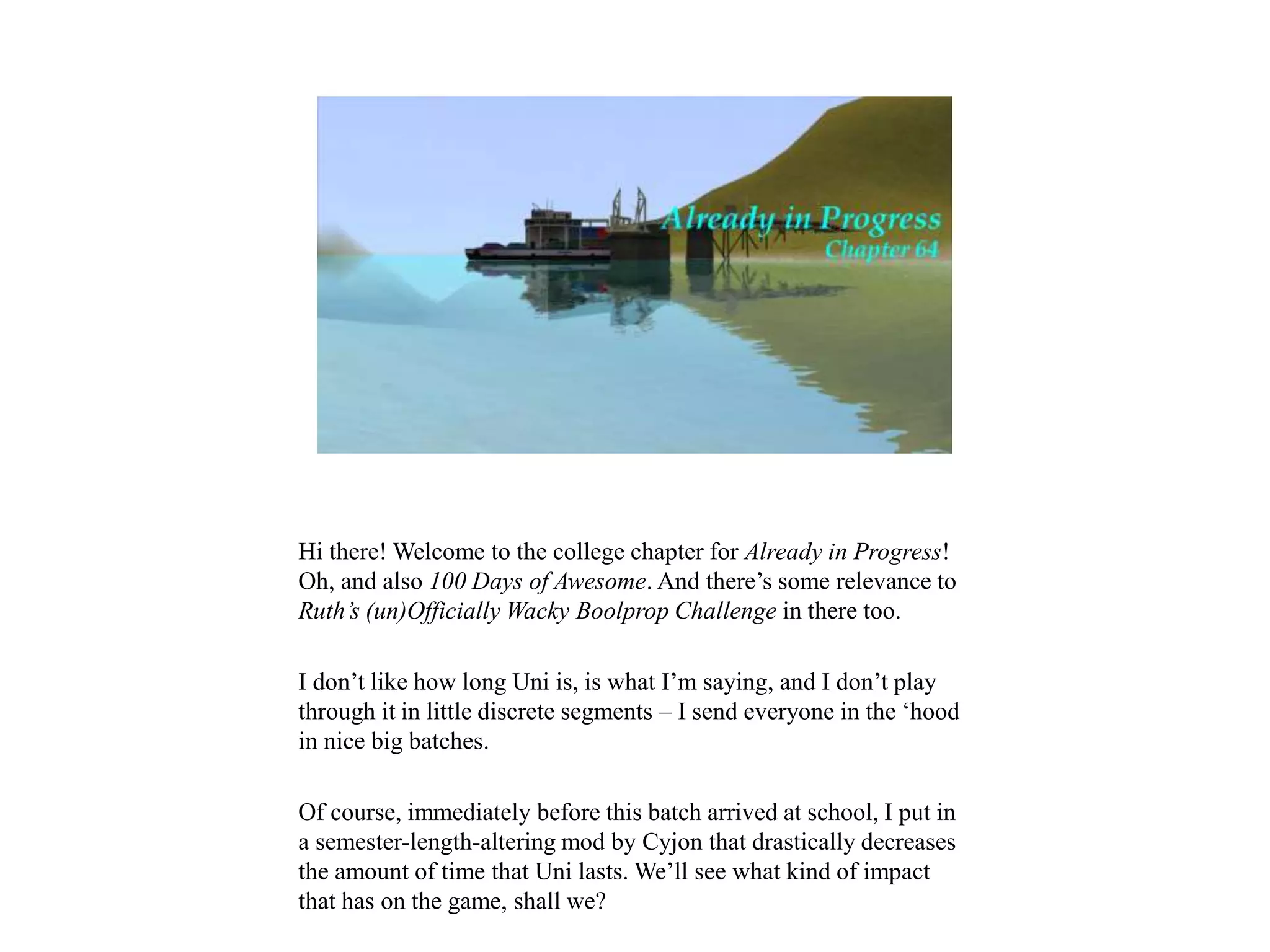 This document provides updates on several Sims attending university. Nicholas had issues with cheating at chess but bonded with Vyn through dancing. His relationship with Vyn was nearly romantic but didn't achieve the highest level. Helen and Alexander went on unsuccessful dates after not seeing each other for years. Georgiana had a successful college experience, pledging a sorority and staying in a relationship with Paul. Paul socialized regularly and had a good university experience overall. Trudy's time at university is also briefly discussed.