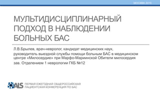 Первая ежегодная общероссийская пациентская конференция по БАС в Москве в 2015 году сосредоточена на мультидисциплинарном подходе к наблюдению за больными, предоставляя диагностику, лечение, психологическую и духовную помощь. В конференции участвуют многопрофильные специалисты и волонтеры, активно поддерживающие пациентов и их семьи. Обсуждаются проблемы позднего обращения и сложности организации помощи, а также поднимаются вопросы финансирования и юридической поддержки.