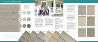 Cypress Creek is a new type of variegated vinyl siding that replicates the look of hand-brushed, stained cedar with multiple colors in each panel. This eco-friendly siding boasts durability and maintenance freedom, available in various styles and colors, and is backed by lifetime warranties. Alside emphasizes high-quality materials and manufacturing standards to ensure exceptional performance and beauty in exterior design.