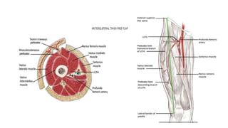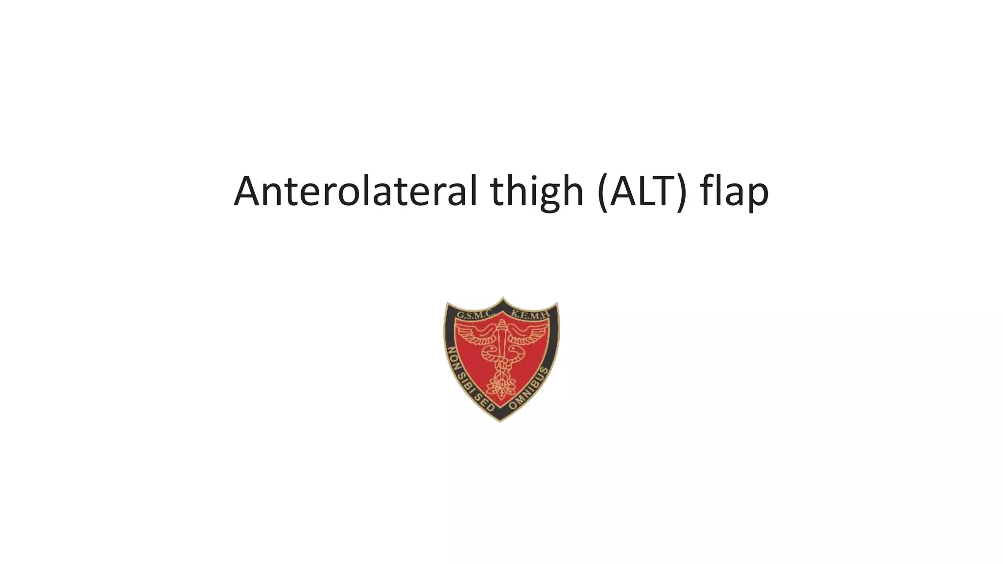 The anterolateral thigh (ALT) flap is a versatile soft tissue flap that can be used as a pedicled or free flap for reconstruction. It is supplied by septocutaneous or musculocutaneous perforators from the lateral circumflex femoral artery. The ALT flap is commonly used to reconstruct defects of the head and neck, extremities, breast, and perineum due to its long pedicle and ability to provide skin and soft tissue with or without muscle. While it has many advantages like long pedicle length and versatility, disadvantages include potential skin grafting at the donor site and contour abnormalities.