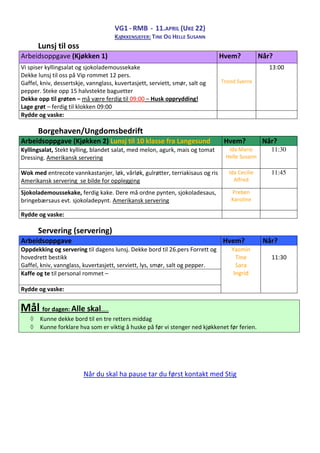 Arbeidsoppgave (Kjøkken 2) Lunsj til 10 klasse fra Langesund Hvem? Når?