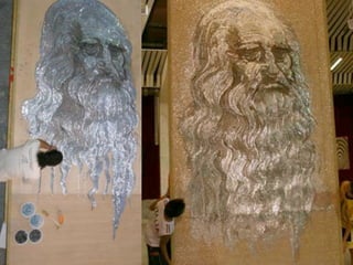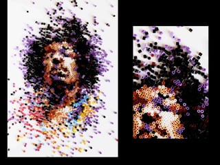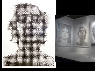 This document lists the names of various artists and their works including Chuck Close who created a self-portrait in 1997 and part of a fingerprint series in 1986. It also mentions works by Saimir Strati, Joseph Barbaccia, Ian Wright, T.I., Andrew Salomone, Jason Mecier, Erika Iris Simmons, and Eric Daigh who used 25,000 pushpins in each of his pushpin portraits. Pete Fecteau is also listed.