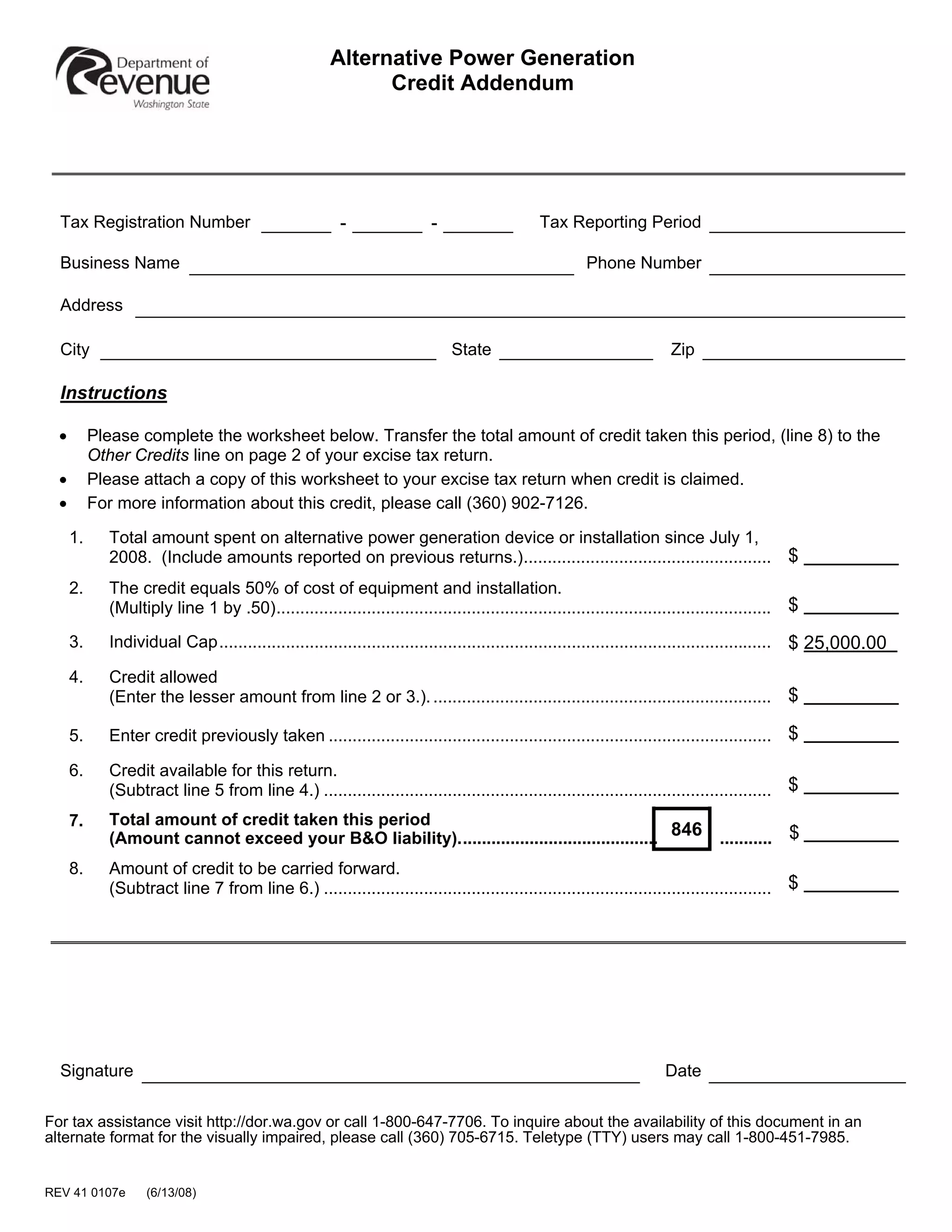 The document is an addendum form for claiming a tax credit for alternative power generation in Washington state. It provides instructions for calculating the credit amount based on 50% of eligible costs, with an individual cap of $25,000. The taxpayer fills out the form to determine the credit available for the current tax period and any amount to be carried forward.