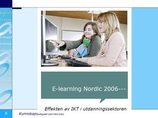 Effekter av lærerneskompetanseutvikling Hvilken effekt har lærernes deltagelse i kompetanseutvikling? Det er lagt ned mye ressurser i å utvikle lærernes IKT-kompetanse. Undersøkelsen viser imidlertid at til tross for at to av tre lærere har deltatt i kompetanseutvikling for IKT i løpet av de siste tre årene, så er det kun én av tre blant disse lærerne som føler seg sikre i forhold til IKT, og det kan ikke registreres noen særlig effekt på bruken av IKT.