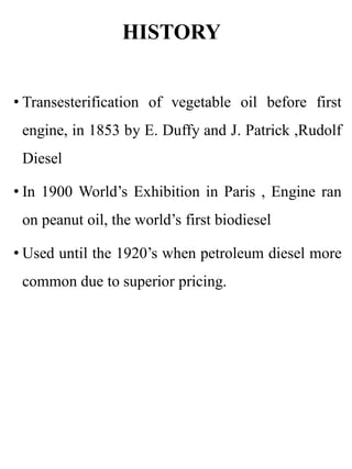 This document provides an overview of biodiesel production, advancement, and future scope. It discusses the history of biodiesel from its first use in engines in 1853 to its replacement by petroleum diesel in the 1920s. The document then covers biodiesel definitions, production via transesterification, feedstock types from various generations, emissions reductions from biodiesel blends, national biofuels policy in India, and considerations for biodiesel as a future fuel alternative but not primary fuel. In summary, the document outlines the history, production process, policies and future of biodiesel as a renewable fuel.