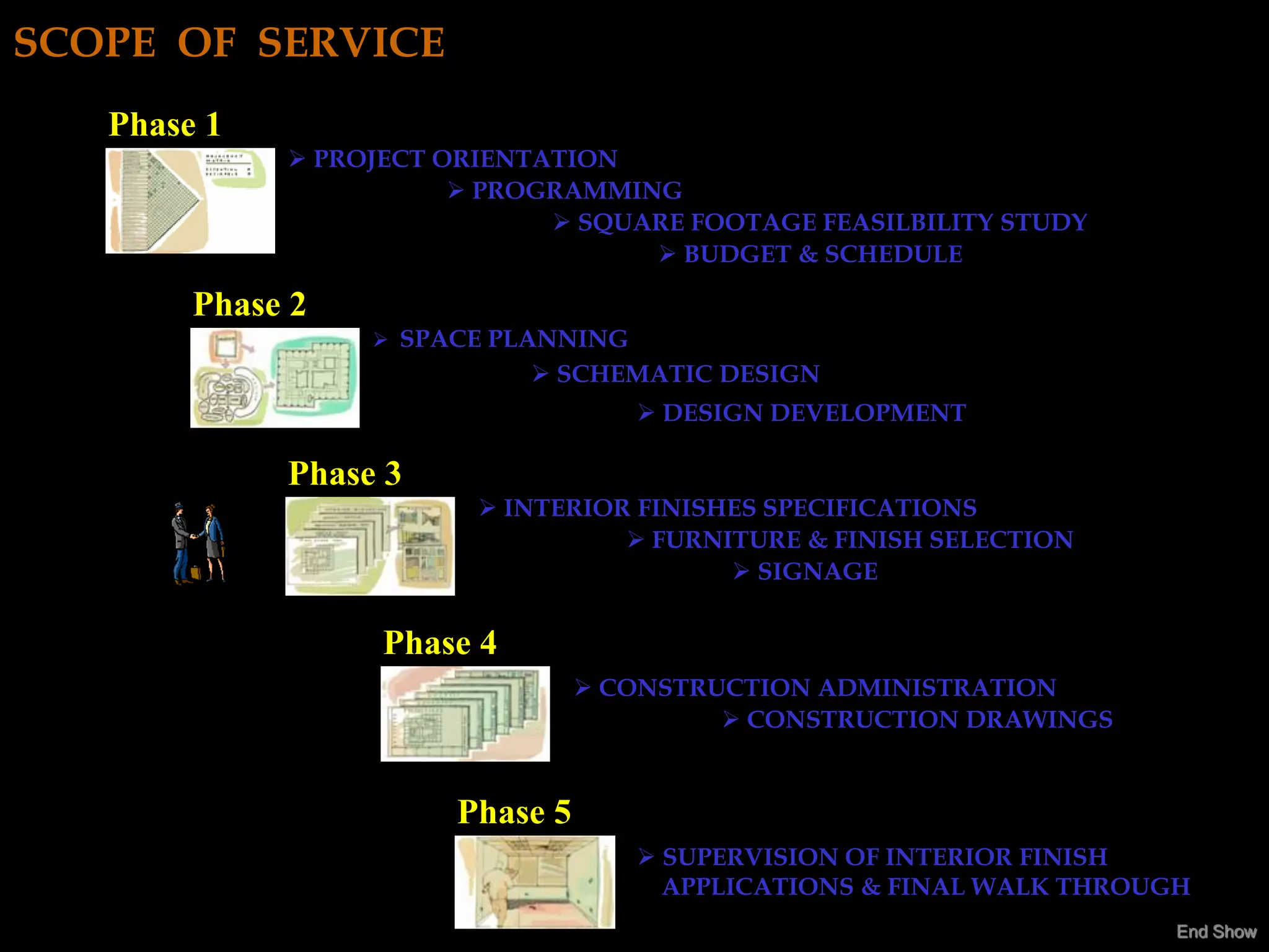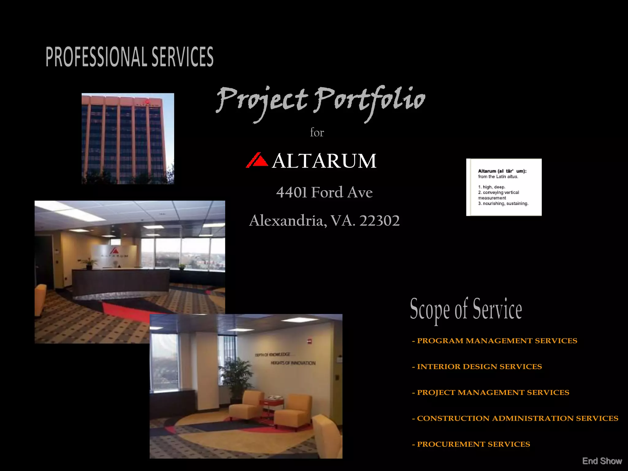 The document provides details on a project portfolio for Altarum located at 4401 Ford Ave in Alexandria, VA. It outlines a 5 phase scope of service including project orientation, programming, space planning, construction administration, and supervision of interior finishes. It then provides a proposal and fee schedule broken down by phase. The final section provides programming details including area and personnel summaries, department requirements, and a conclusion recommending a hybrid scenario to maintain flexibility.