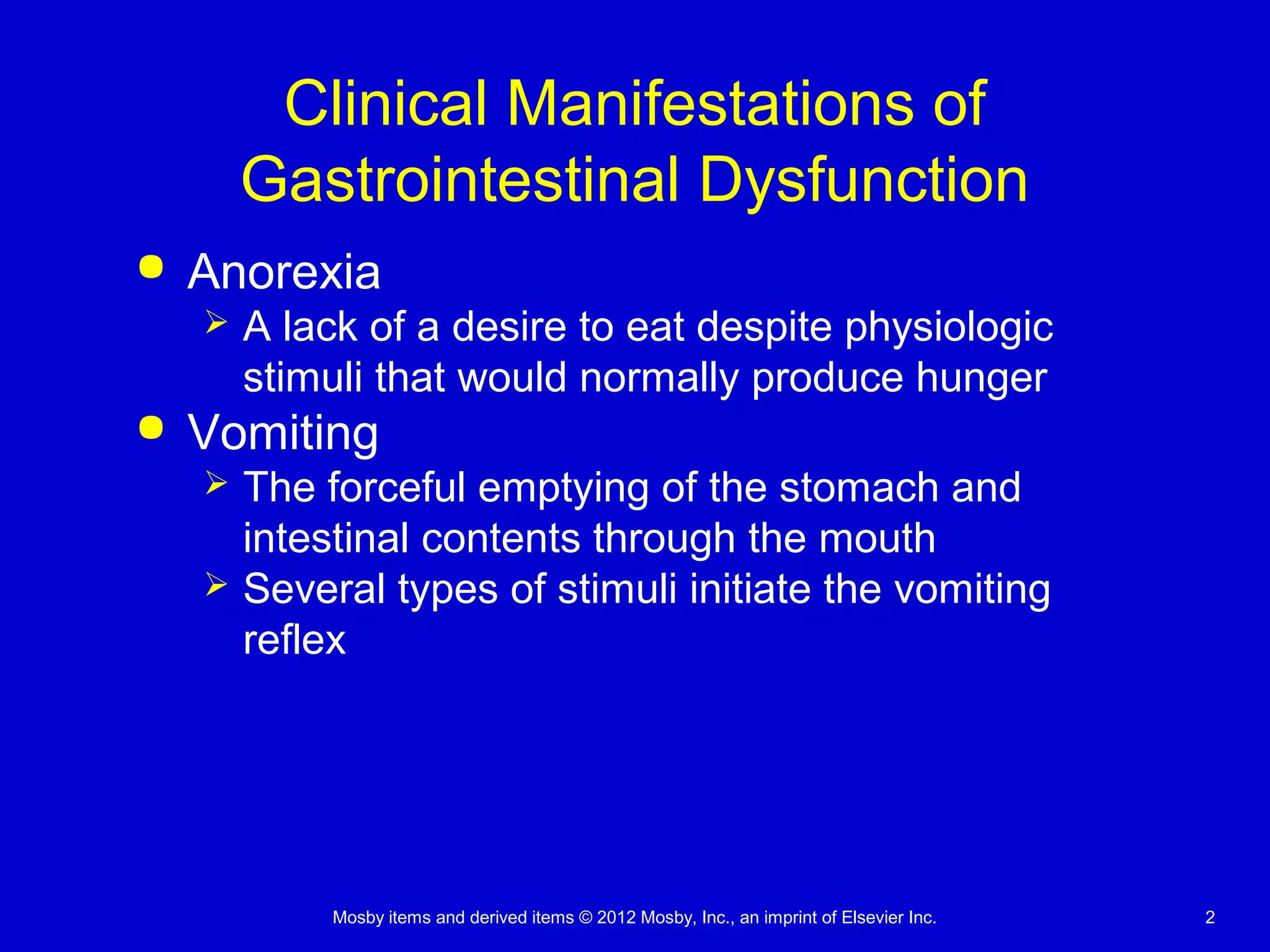The document discusses various gastrointestinal dysfunctions and disorders including their clinical manifestations and pathophysiology. It covers conditions affecting the esophagus, stomach, small and large intestines, such as gastroesophageal reflux disease, peptic ulcers, irritable bowel syndrome, inflammatory bowel diseases, and malabsorption syndromes. It provides details on the symptoms, causes, and treatments of these common digestive disorders.
