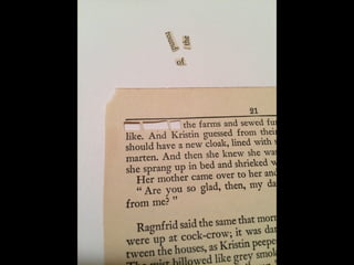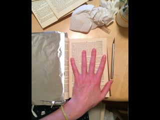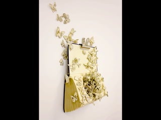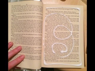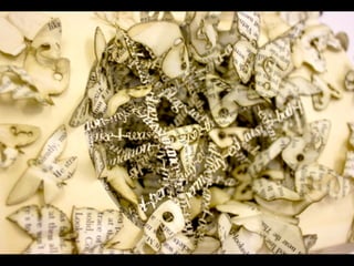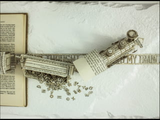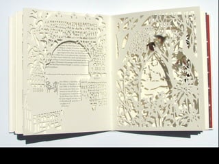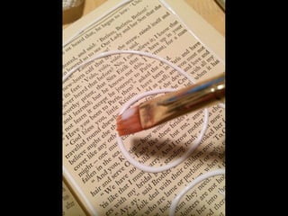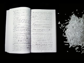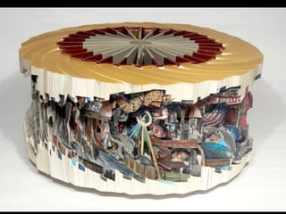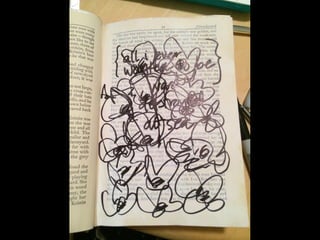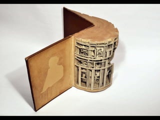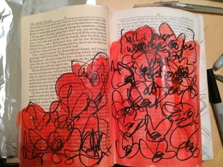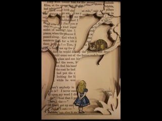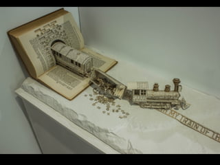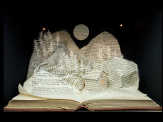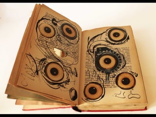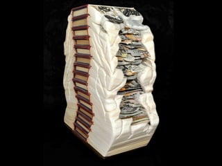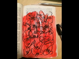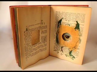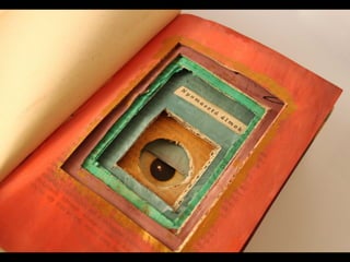 The document discusses techniques for altering books, including painting, collage, cutting out words and shapes, creating folds, windows and doors, sculpting 3D elements and pop-ups, adding drawers and compartments, and experimenting with layout. It also mentions reacting to or reflecting on the book's content, telling stories, and exploring themes in multiple ways. The document encourages the reader to try various techniques without fear and notes elements can be changed by cutting, painting over or starting a new book.