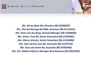 Dhr. Bertus BoveRA, Directeur (06-22206070) Dhr. Piet-Jan Boringa RA MBA, Directeur (06-51114341) Dhr. Peter van den Berg, General Manager (06-14390690) Dhr. Arthur Torn RA, Senior Consultant (06-21293085) Dhr. Marco Schmitz, Senior Consultant (06-21244986) Dhr. Hans Gerrits Jans RA, Associate (06-21527724) Dhr. Kees van Asten RA, Associate (06-54783844) Dhr. Drs. Robbert Zijlstra, Manager New Business (06-29537262)